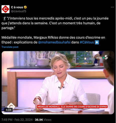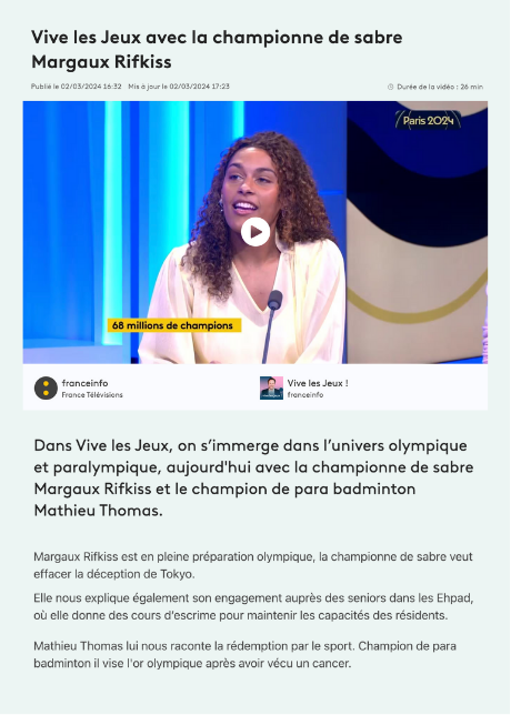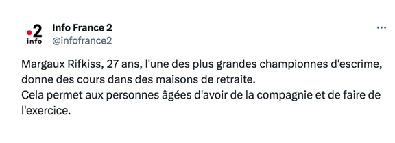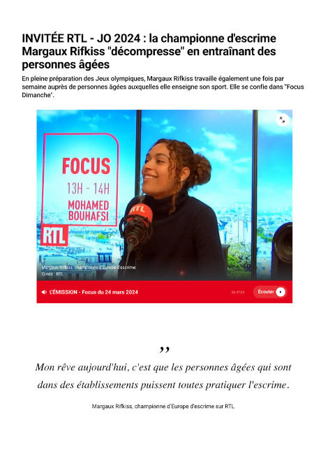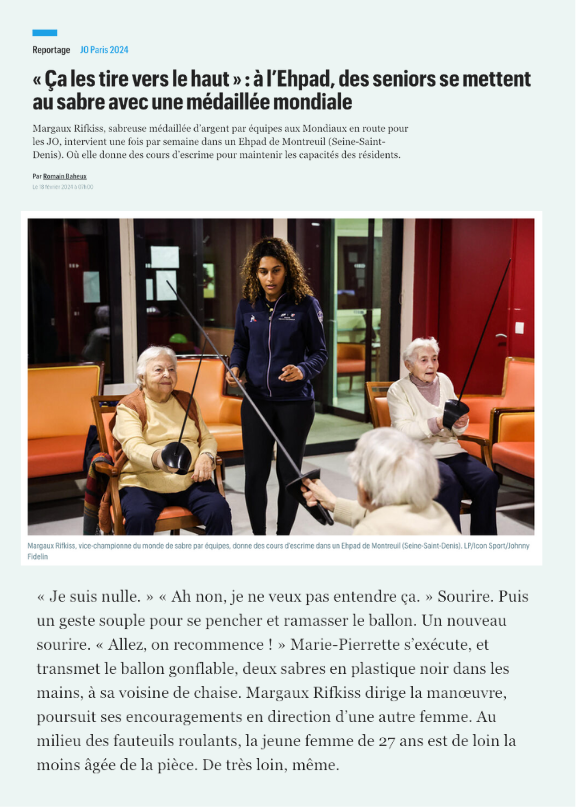 Formée dans un club où l’escrime été mit au service des enfants précoces et des femmes atteintes du cancer du sein, j’ai été sensibilisée aux bienfaits de mon sport très jeune. Après avoir passé mon diplôme de Maitre d’arme, je me suis spécialisée pour intervenir auprès des publics séniors et en EHPAD.